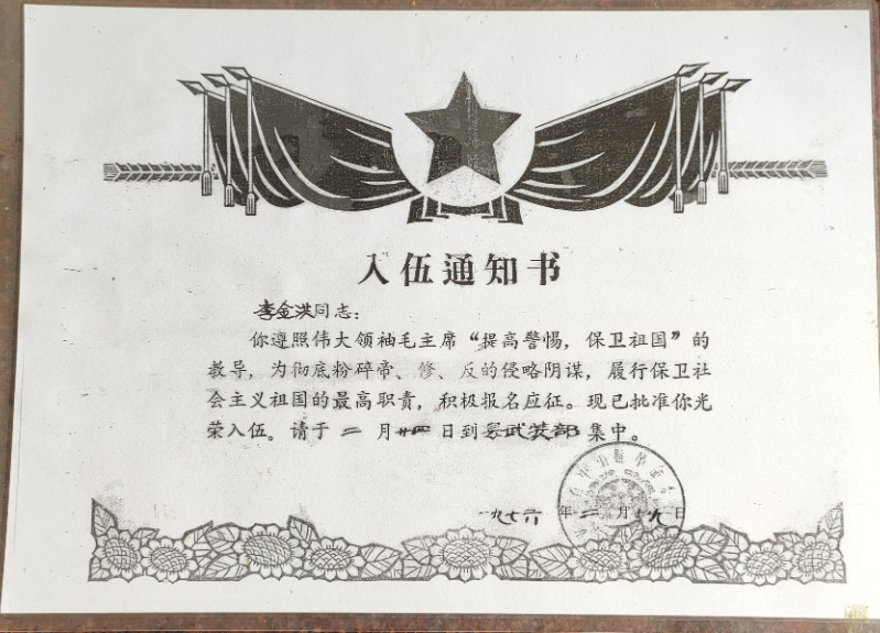 1976年2月,李金洪(第一排右二)春季應(yīng)征入伍大合照 炮火洗禮,浴血奮戰(zhàn) 1979年2月17日,天還未亮,中越邊境線(xiàn)上萬(wàn)炮齊發(fā),漆黑的天空霎時(shí)被炮火染紅。震耳欲聾的炮火聲、沖鋒陷陣的吶喊聲如同驚雷般在李金洪耳邊炸響,令他熱血沸騰,一片空白的腦海瞬間被浴血?dú)场Z取勝利的斗志填滿(mǎn)。 這是李金洪作為53258部隊(duì)尖刀班機(jī)槍手參加1979年對(duì)越自衛(wèi)反擊戰(zhàn)的記憶。當(dāng)時(shí),尖刀班肩負(fù)著沖在隊(duì)伍最前方、為主力部隊(duì)擋下槍炮等最為急難險(xiǎn)重的任務(wù)。 從2月17日到3月16日,從靠松山到三埡口,在持續(xù)一個(gè)月的山地戰(zhàn)爭(zhēng)中,李金洪和戰(zhàn)友們每天僅靠吃干糧野果、喝河水充饑,整整一個(gè)月的時(shí)間里衣服干了又濕,濕了又干,有時(shí)受傷之后,傷口和衣服都粘在一起,疼痛無(wú)比。當(dāng)時(shí)雖然又累又困,但是戰(zhàn)士們的眼睛始終都是保持睜開(kāi)的,因?yàn)閿橙穗S時(shí)都會(huì)出現(xiàn)在附近,瞬間就是你死我活的戰(zhàn)場(chǎng)。就這樣,李金洪一直以堅(jiān)定信念和頑強(qiáng)精神在戰(zhàn)場(chǎng)殺敵,直到戰(zhàn)爭(zhēng)結(jié)束。 生死一瞬間,火線(xiàn)立軍功 1979年3月10日,尖刀班接到了去三埡口搜山的任務(wù),突然與敵軍遭遇,當(dāng)時(shí)尖刀班只配備了一挺機(jī)槍?zhuān)罱鸷榫褪菣C(jī)槍手,當(dāng)時(shí)由于地形對(duì)我方不利,不便發(fā)動(dòng)火力打擊和進(jìn)行蔭蔽工作。這時(shí),班長(zhǎng)一邊指揮2名戰(zhàn)士立即下山給后方的大部隊(duì)報(bào)信,一邊組織全班沉著埋伏,等待敵人靠近。 當(dāng)敵人離陣地只有幾米時(shí),作為班里唯一機(jī)槍手的李金洪突然挺起機(jī)槍準(zhǔn)備開(kāi)火,敵軍看到機(jī)槍慌亂朝他射擊,李金洪迅速閃躲,避開(kāi)飛來(lái)的子彈,隨即向敵人開(kāi)火,首發(fā)即擊斃領(lǐng)頭敵軍,并成功搶占有利地形,用猛烈的火力掩護(hù)全班戰(zhàn)斗,敵人四處逃竄。 僅用半小時(shí),尖刀班就消滅了4名敵人、俘虜1名,繳獲半自動(dòng)步槍2支,并且全班無(wú)一人員傷亡,打下一場(chǎng)漂亮的伏擊戰(zhàn)??克缮健|溪、高平、茶靈、廣淵、下瑯……對(duì)越自衛(wèi)反擊戰(zhàn)期間,李金洪保家衛(wèi)國(guó)浴血奮戰(zhàn),出色地完成了上級(jí)交給的護(hù)衛(wèi)和戰(zhàn)斗任務(wù),榮立個(gè)人三等功1次。