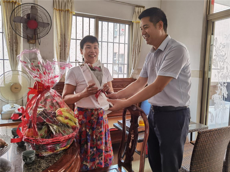 ▲南頭鎮(zhèn)退役軍人服務(wù)中心走訪慰問邊防海防現(xiàn)役軍人母親。 每到一戶,南頭鎮(zhèn)退役軍人服務(wù)中心主任黃國全都為“兵媽媽”獻(xiàn)上鮮花和果籃,并了解邊防海防現(xiàn)役軍人在部隊(duì)的服役情況,以及家屬身體狀況、生活、工作等情況,對她們默默支持孩子為國防建設(shè)作貢獻(xiàn)致以崇高的敬意。 “謝謝你們今天專程來看望我,我感到黨和國家對軍人軍屬越來越重視,作為邊防軍人家屬尤其感到驕傲和自豪!我們將一如既往地支持他在邊防站好崗、放好哨,為國防出力!”邊防官兵何財(cái)華媽媽說道。 |