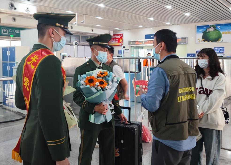 3月1日,中山市坦洲鎮(zhèn)退役軍人服務(wù)中心工作人員會(huì)同退役士兵家屬前往珠海明珠站迎接中山市2023年首批春季退役士兵平安返鄉(xiāng)。在車站出口,工作人員為退役士兵獻(xiàn)上鮮花,退役士兵與家人深情相擁,“最可愛(ài)的人”返鄉(xiāng)第一時(shí)間就感受到了來(lái)自家鄉(xiāng)及親人的貼心服務(wù)和溫暖。