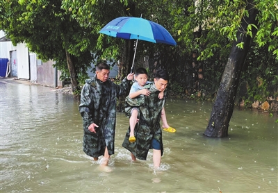 退役軍人梁卓興和泉眼村消防站隊員一起涉水將小朋友安全送回家中。通訊員供圖