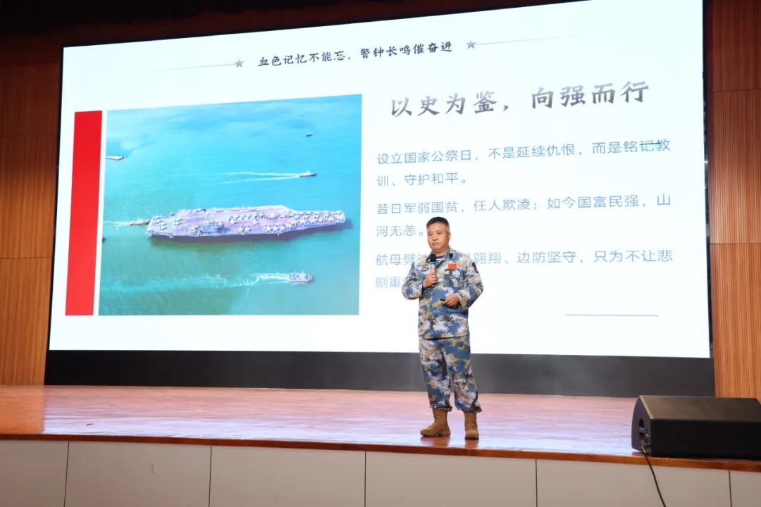 活動邀請中山港口鎮(zhèn)人民武裝部副部長賀洪彪以《銘記歷史守海疆 青春立志報家國》為題開展專題講座,帶領師生重溫南京大屠殺那段山河破碎的屈辱歷史,闡釋國家公祭日的設立意義,讓師生深刻理解“銘記歷史、勿忘國恥”的意義?,F(xiàn)場莊嚴肅穆,全體師生為南京大屠殺死難同胞默哀,用無聲的敬意寄托對逝者的哀思。 會上,賀洪彪結(jié)合自身十五載南沙守礁經(jīng)歷,講述“以礁為家、以苦為榮”的崢嶸歲月,用軍人的忠誠與信仰,詮釋新時代國防衛(wèi)士守護家國的責任擔當,讓師生們真切感受到和平生活的來之不易。