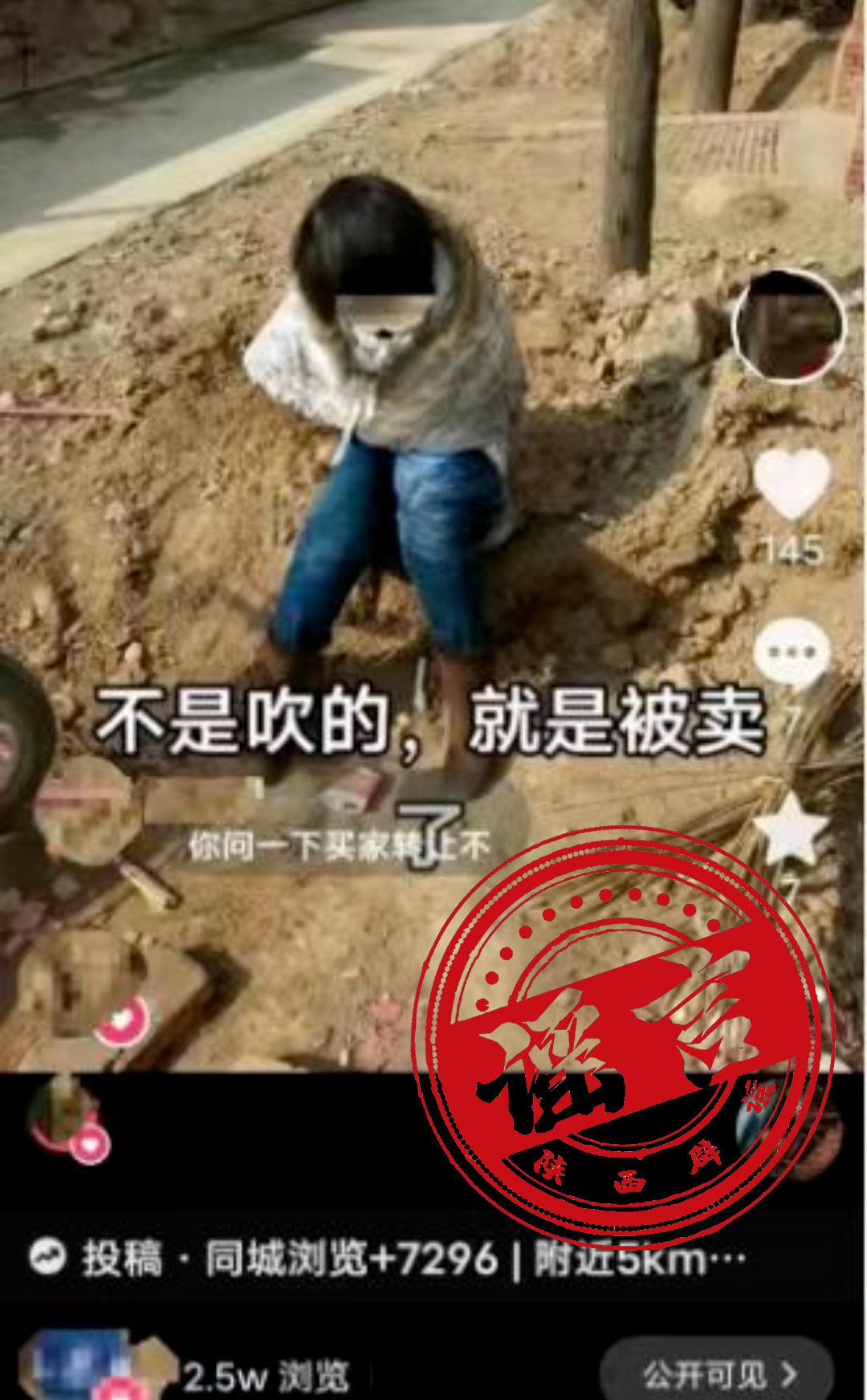 2024年1月10日,網(wǎng)民張某某(女,39歲,蒲城龍陽人)為博取關注、吸引流量,利用了一張自己14年前拍攝坐在土堆前的照片,并配有“不是吹的,就是被賣了”的字眼制作成視頻后,發(fā)布在抖音平臺上,同時與網(wǎng)民互動交流,先后有超過2.5萬人次瀏覽。