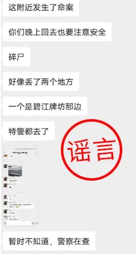 4月22日上午,網(wǎng)民莫某(男,28歲)在其小區(qū)業(yè)主群發(fā)布消息,稱“最近幾天碧江附近發(fā)生了命案”。隨后,該謠言被陳某(女,38歲)刷到,在未驗(yàn)證真實(shí)情況下,陳某將謠言轉(zhuǎn)發(fā)到聊天群,并發(fā)表“北滘發(fā)生碎尸案”等不實(shí)言論。最終導(dǎo)致多名網(wǎng)友在未經(jīng)證實(shí)的情況下,轉(zhuǎn)發(fā)謠言到多個微信群內(nèi),造成較惡劣的社會影響。