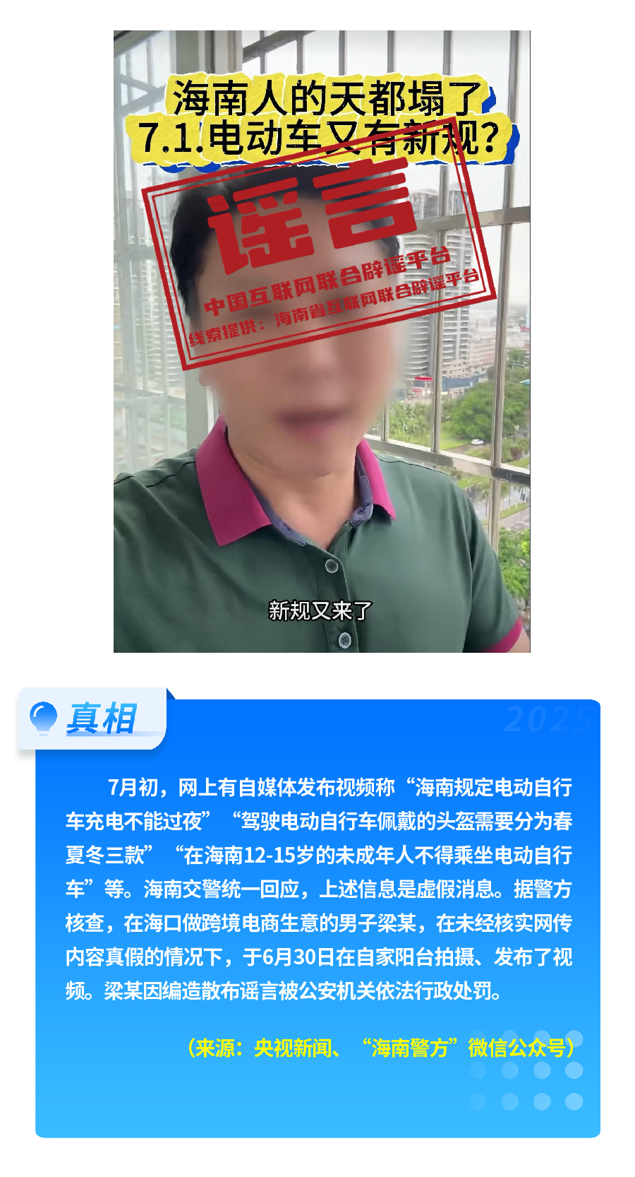有人重新翻炒“醫(yī)?!畟€人賬戶’將全部取消”舊謠,故意歪曲醫(yī)保改革真實內(nèi)涵,嚴重誤導(dǎo)公眾對醫(yī)保改革政策的理解。“有專人上門服務(wù)激活醫(yī)保碼”,披著“公共服務(wù)”的外衣,實有詐騙之嫌和安全風(fēng)險。憑空捏造“海南規(guī)定電動自行車充電不能過夜、頭盔分三季”這一“奇葩規(guī)定”,以“新規(guī)”話術(shù),擾亂交通管理秩序。
