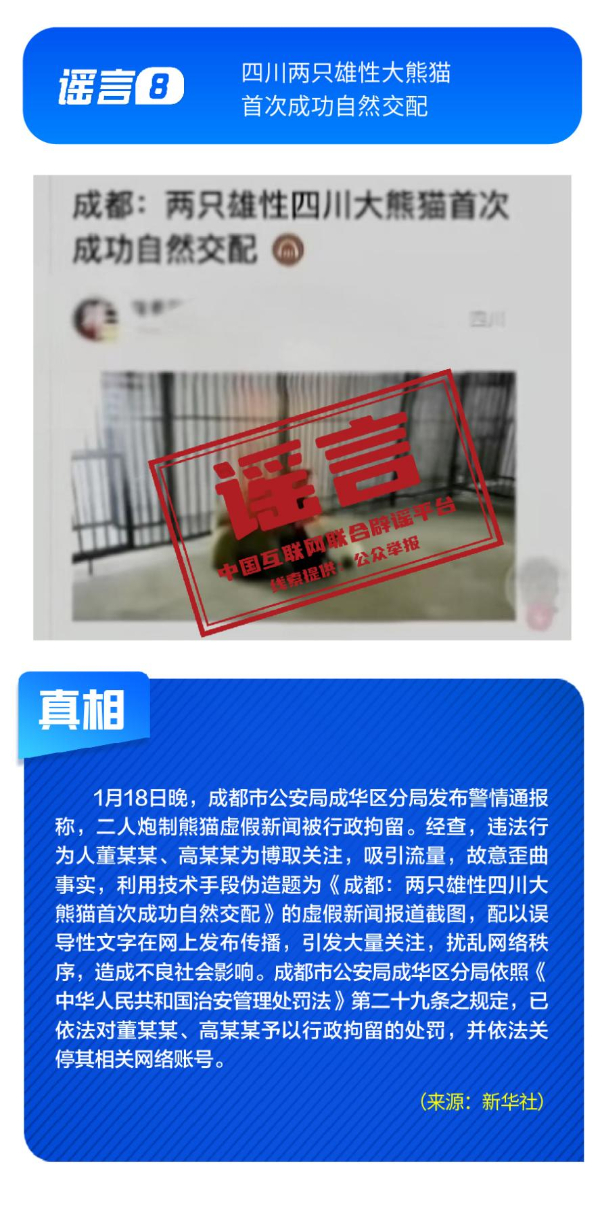 針對各類網(wǎng)絡(luò)謠言與亂象,多部門開展協(xié)同治理,聯(lián)動整治。1月16日,中央網(wǎng)信辦召開全國網(wǎng)絡(luò)辟謠聯(lián)動機(jī)制第三次全體會議,部署以辟謠工作新成效助力清朗網(wǎng)絡(luò)空間建設(shè)。中央網(wǎng)信辦聯(lián)合工業(yè)和信息化部等部門持續(xù)整治汽車行業(yè)網(wǎng)絡(luò)亂象,處置一批涉嫌挑動對立、炒作負(fù)面話題、違規(guī)測評的賬號;國家廣播電視總局開展“AI魔改”視頻專項(xiàng)治理,各平臺處置大量違規(guī)內(nèi)容。各地網(wǎng)信部門積極行動,陜西西安深入開展房地產(chǎn)領(lǐng)域網(wǎng)絡(luò)專項(xiàng)行動,處置散布樓市謠言的房產(chǎn)中介賬號,四川成都依法處置30余個惡意關(guān)聯(lián)地域、污名化城市的違規(guī)賬號。公安機(jī)關(guān)依法打擊造謠傳謠人員。擺拍“小女孩在學(xué)校跳蚤市場用50元淘到名酒”、利用AI偽造“假救護(hù)車非法轉(zhuǎn)運(yùn)”、編造“兩只雄性四川大熊貓首次成功自然交配”等謠言的相關(guān)責(zé)任人已依法被予以行政處罰。