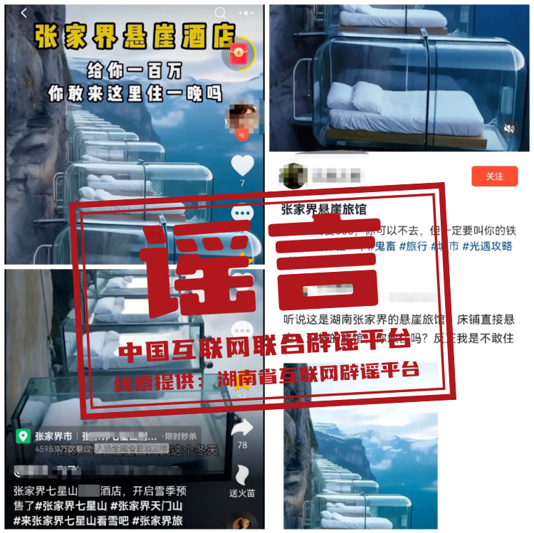 真相:近日,某短視頻平臺(tái)出現(xiàn)多條所謂“張家界懸崖酒店”的視頻,視頻顯示“幾張由玻璃罩著的床,整齊地排列在懸崖上”,文案稱“張家界懸崖旅館房費(fèi)一個(gè)晚上500元”。對(duì)此,經(jīng)媒體記者采訪核查,張家界文旅局及張家界國(guó)家森林公園景區(qū)工作人員均表示“不知道懸崖旅館”。同時(shí),記者問(wèn)詢張家界多家酒店、客棧,均未找到視頻中的“懸崖酒店”。(來(lái)源:上游新聞)