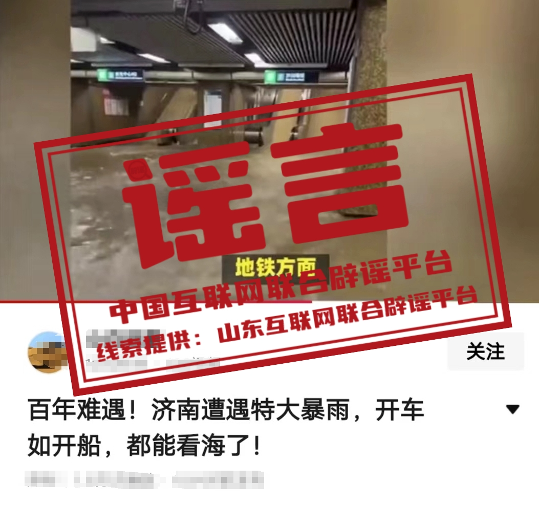 真相:7月22日,一則內(nèi)容為“百年難遇!濟(jì)南遭遇特大暴雨,開車如開船”的視頻信息在網(wǎng)絡(luò)傳播,視頻中還摻雜“車庫倒灌”“地鐵被淹”等水災(zāi)畫面。經(jīng)當(dāng)?shù)叵嚓P(guān)部門核實,濟(jì)南市氣象臺于22日11時解除雷雨大風(fēng)黃色預(yù)警信號,當(dāng)日并未出現(xiàn)特大降雨情況。視頻中的地鐵、街道等場景不在濟(jì)南。該視頻信息為謠言。(來源:山東互聯(lián)網(wǎng)聯(lián)合辟謠平臺、濟(jì)南互聯(lián)網(wǎng)聯(lián)合辟謠平臺)