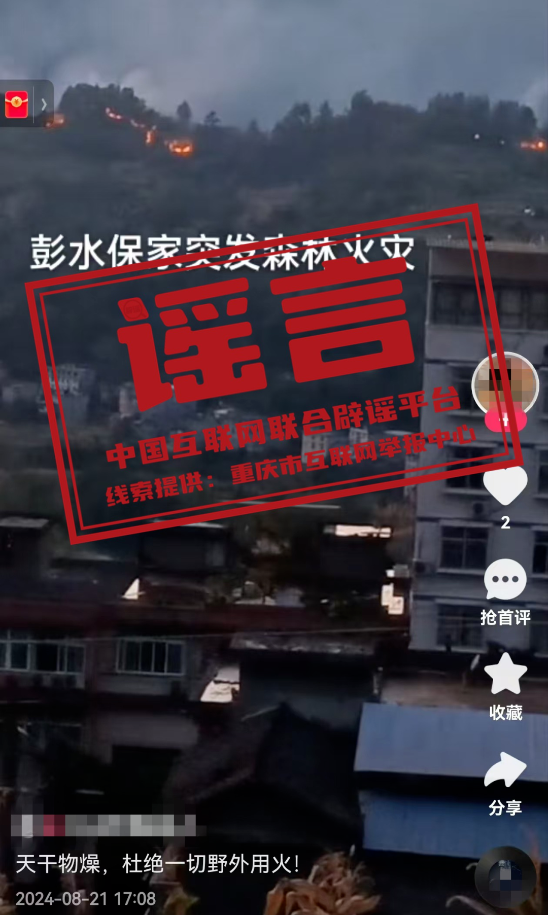 真相:8月21日,某網(wǎng)民發(fā)布視頻并配文“彭水保家突發(fā)森林火災(zāi)”,引發(fā)關(guān)注。經(jīng)屬地網(wǎng)信部門核實(shí),重慶彭水近期未發(fā)生此類事件,網(wǎng)傳信息系謠言。目前,謠言線索已轉(zhuǎn)交相關(guān)部門對(duì)造謠者進(jìn)行進(jìn)一步調(diào)查處置。(來源:@重慶辟謠)