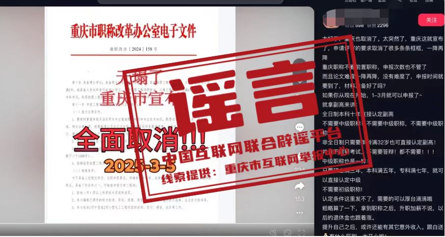 真相:近日,有網(wǎng)民在互聯(lián)網(wǎng)平臺(tái)發(fā)布消息稱(chēng)“重慶市宣布,申請(qǐng)?jiān)u審的要求取消了很多條條框框,職稱(chēng)申請(qǐng)不看前置職稱(chēng),全日制本科十年直接認(rèn)定副高,不需要中級(jí)職稱(chēng)”,引發(fā)關(guān)注。經(jīng)核實(shí),網(wǎng)傳信息系謠言。職稱(chēng)評(píng)審均需逐級(jí)晉升,取得上一級(jí)職稱(chēng)并滿足相應(yīng)學(xué)歷資歷條件后方可晉升高一級(jí)職稱(chēng)。目前重慶市除特殊人才、博士后等3個(gè)針對(duì)特定對(duì)象的職稱(chēng)申報(bào)綠色通道外,正常申報(bào)通道均需逐級(jí)晉升。網(wǎng)傳文件是網(wǎng)民通過(guò)P圖軟件編輯而成,試圖吸引不明真相的群眾咨詢,借機(jī)推銷(xiāo)職稱(chēng)代辦服務(wù),收取高額費(fèi)用。目前,謠言線索已轉(zhuǎn)交公安機(jī)關(guān)進(jìn)一步調(diào)查處置。(來(lái)源:“重慶辟謠”微信公眾號(hào))