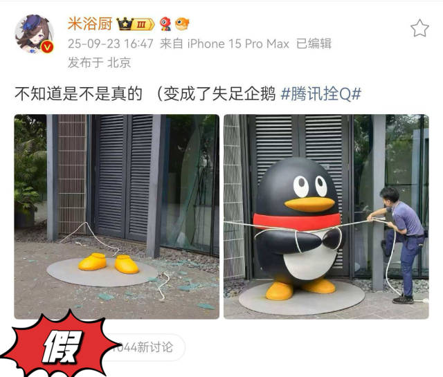 比如騰訊公司門口的企鵝雕塑,公司為了防御臺風,將企鵝用繩拴了起來。而有網(wǎng)民傳播的圖片顯示企鵝只剩雙腳,上身被風吹走。騰訊QQ回應(yīng):“鵝拴著呢,穩(wěn)穩(wěn)的。”
