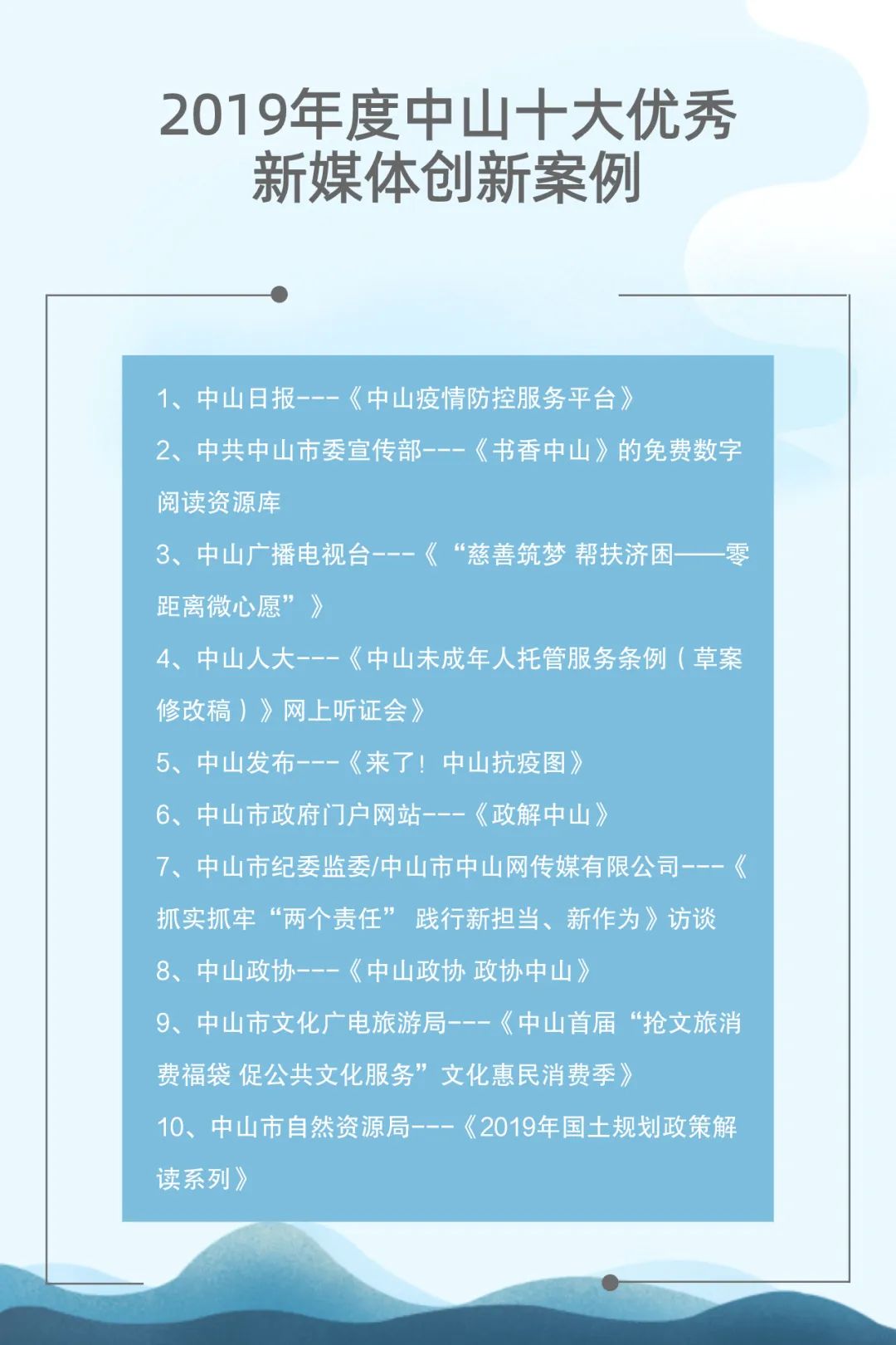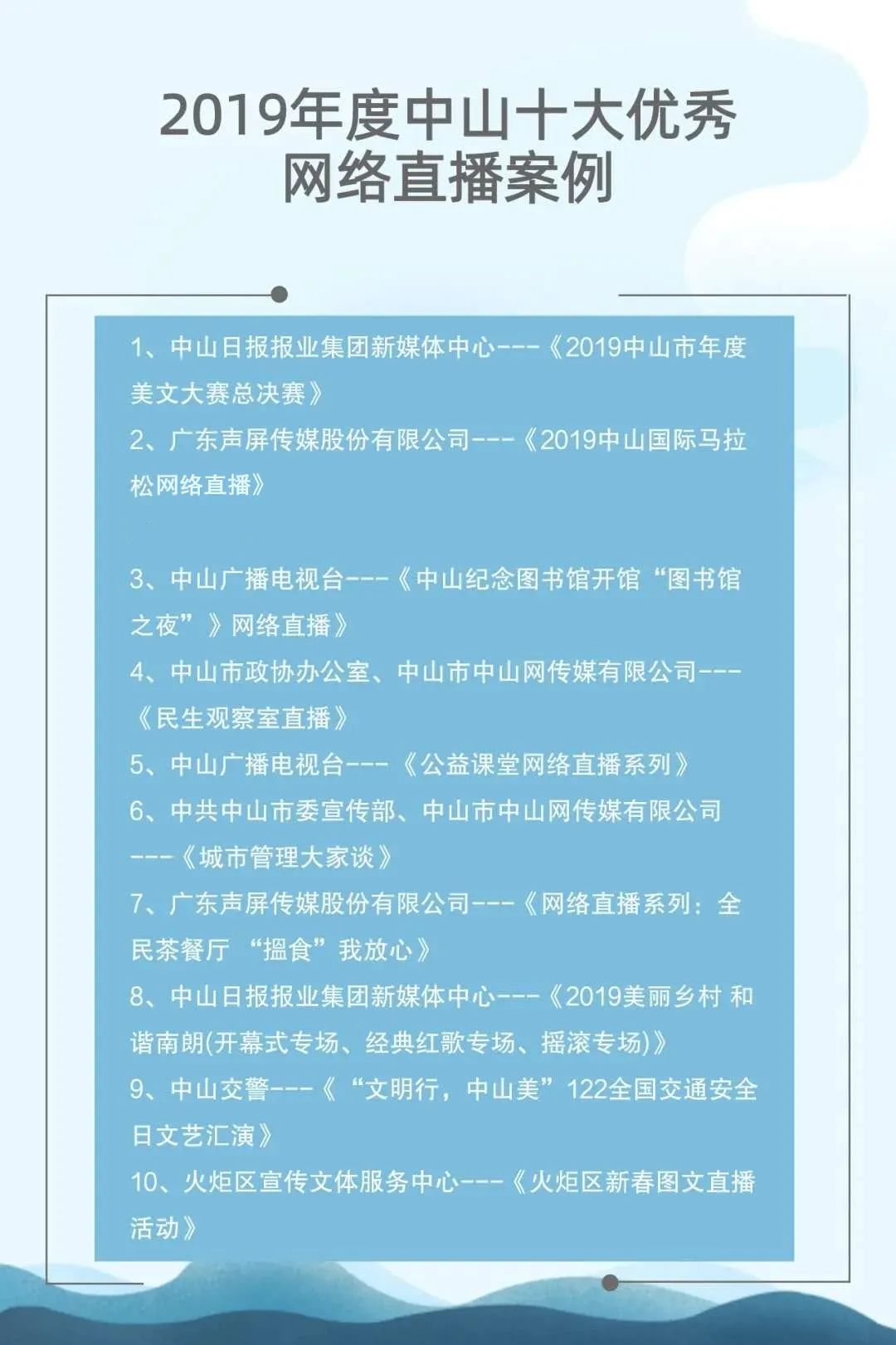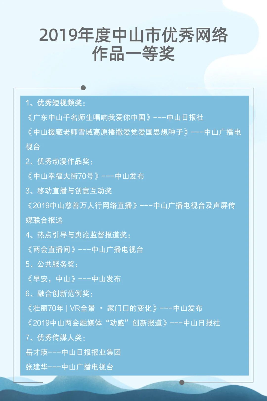 自2015年起,中山市網(wǎng)絡(luò)文化協(xié)會(huì)聯(lián)合中山日?qǐng)?bào)報(bào)業(yè)集團(tuán)、人民網(wǎng)輿情數(shù)據(jù)中心已連續(xù)成功舉辦了四屆中山新媒體影響力年度排行榜發(fā)布會(huì)。與此同時(shí),自2017年起,中山廣播電視臺(tái)聯(lián)合新榜(上??窗裥畔⒖萍加邢薰荆┮惨呀?jīng)連續(xù)成功舉辦了三屆中山市新媒體頒獎(jiǎng)盛典。兩個(gè)評(píng)選活動(dòng)通過立標(biāo)桿、樹典型,有效促進(jìn)了中山新媒體的建設(shè)運(yùn)營(yíng)水平,推動(dòng)了中山新媒體的健康向上發(fā)展。